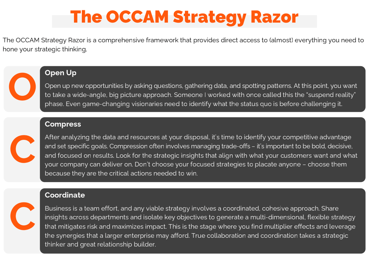 The OCCAM Strategy Razor puts strategic thinking on a page, but at the end of the day, strategic thinking is less about following guidelines and more about adjusting your mentality.