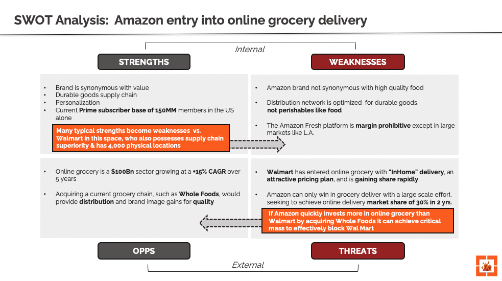 An important note to keep in mind: depending on what you're analyzing with your SWOT, your perceived strengths can actually be a weakness. For instance, Amazon usually has supply chain superiority vs. other organizations. However, going head to head with Walmart in online grocery, Walmart already has physical locations acting as "free" warehouses for all the food it delivers. Amazon can no longer see its durable goods supply chain as a strength in this arena, which is why it needs to consider the acquisition of Whole Foods to adequately compete.